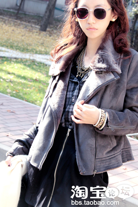 鹿皮大翻领短外套+黑色高腰裙+格子衬衫