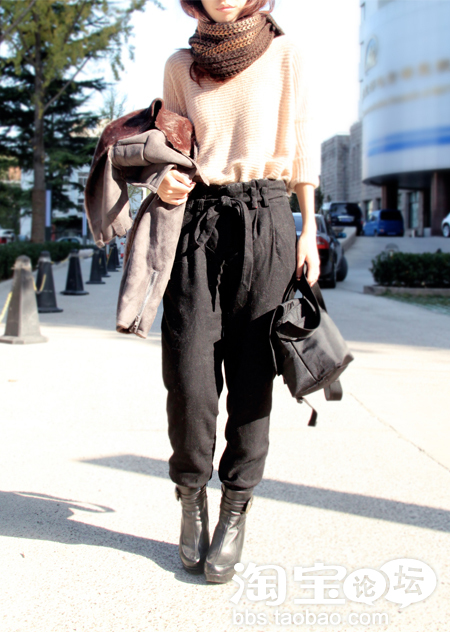 兔毛基本款毛衣+黑色羊毛高腰裤+黑色坡跟靴