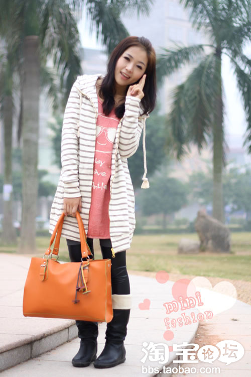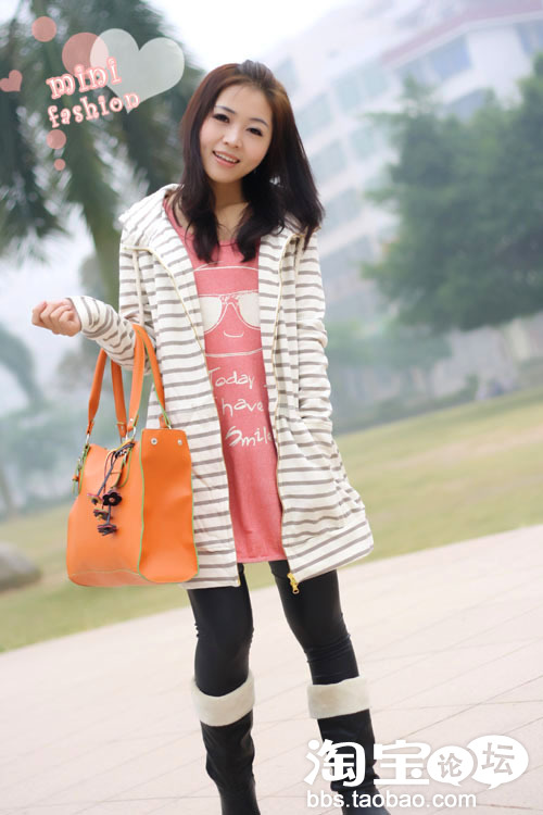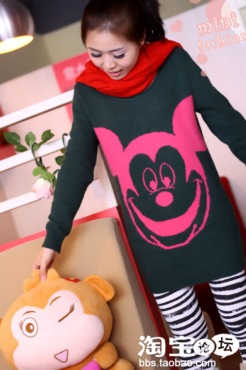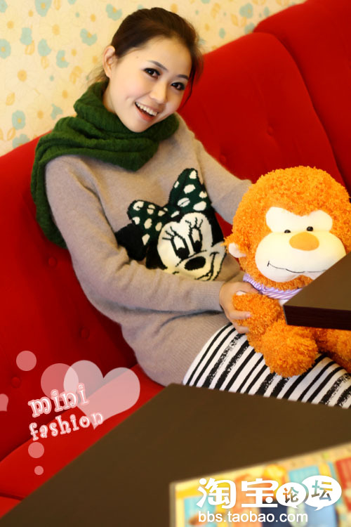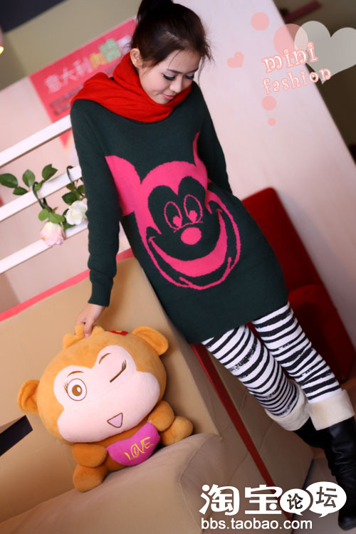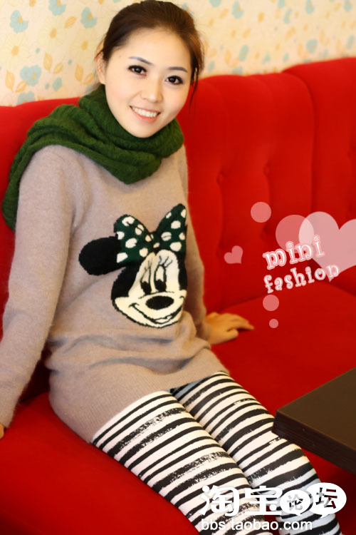 米奇兔毛毛衣+条纹紧身裤+围脖