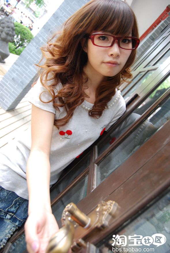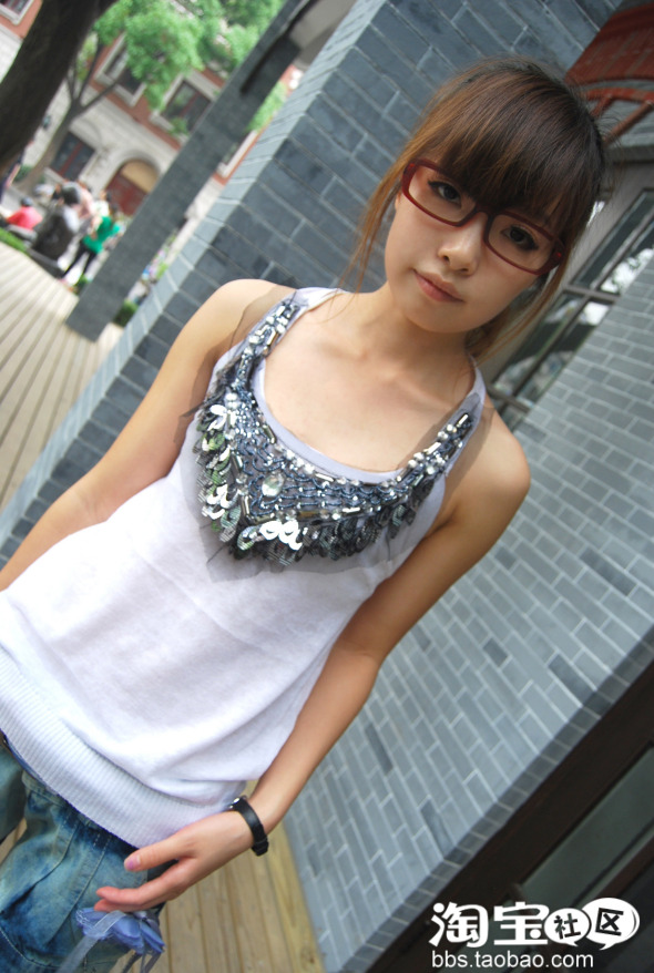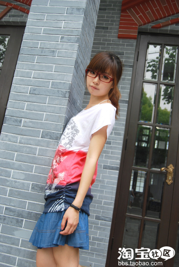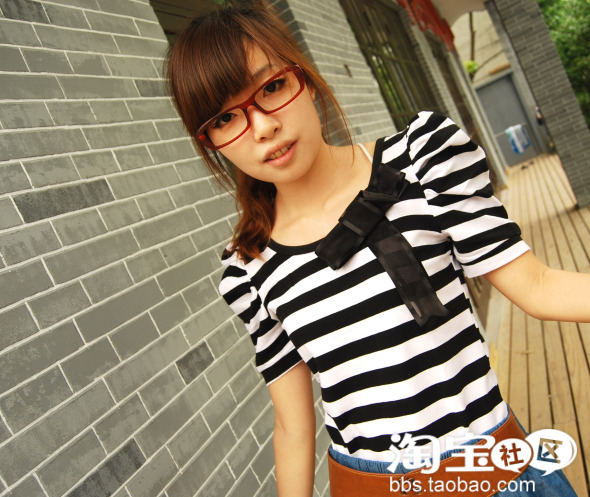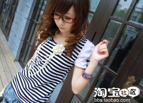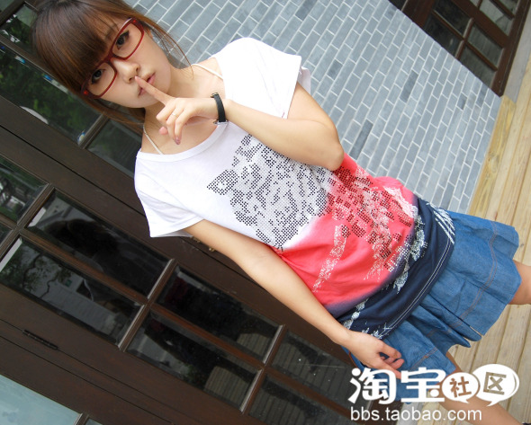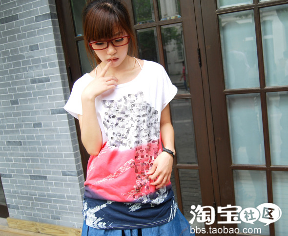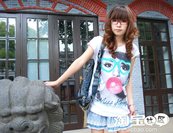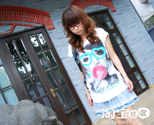简单的大版型休闲T恤,印图很漂亮的哦·蓝色大眼镜+可爱棒棒糖,呵呵现在的女生都学的小物件呐!