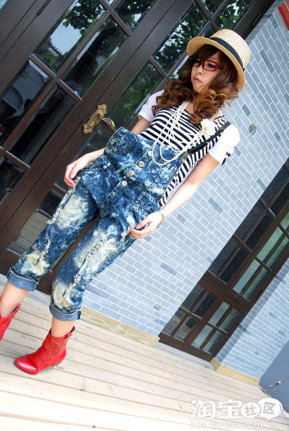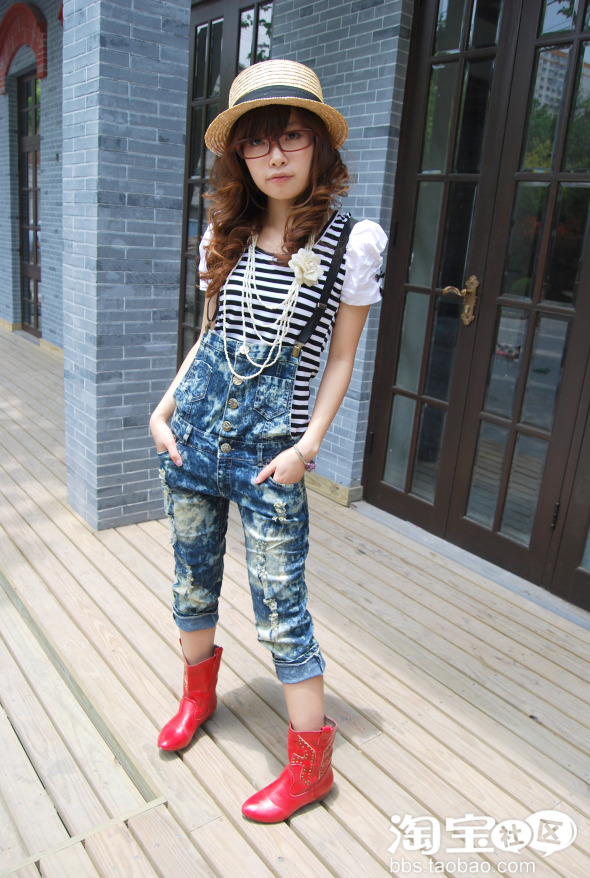 3.草帽+条纹泡泡袖T恤+做旧牛仔背带裤=帅气英伦风公主