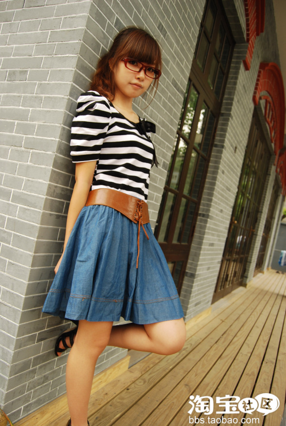 2.宽松大眼睛T恤+牛仔蕾丝短裙=乖乖学院公主