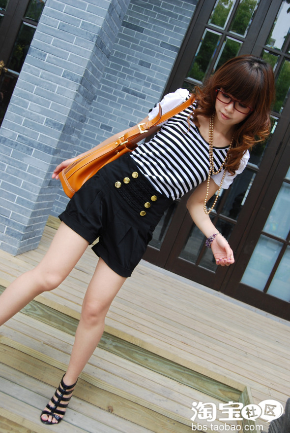 条纹百搭小T恤衫配泡泡袖的设计搭配韩国高腰黑色短裤,很时尚的范儿!