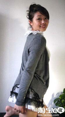背面的我!这是我工作时最喜欢的装扮,是不是很甜美呀!是不是可以让客户不好拒绝你呀?!里面的蕾丝衬衣配灰色针织开衫有一种柔柔的美感,再配上同样蕾丝小A字群,回头率很高呢!