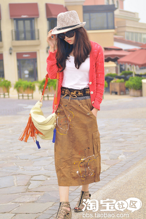 打底小T恤搭配针织开衫下穿了个比较有创意的油漆点女半裙