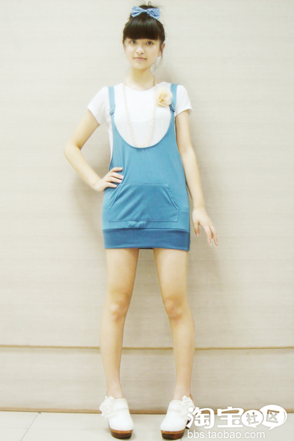 温暖蓝色前口袋背带裙 + 白T 两件套