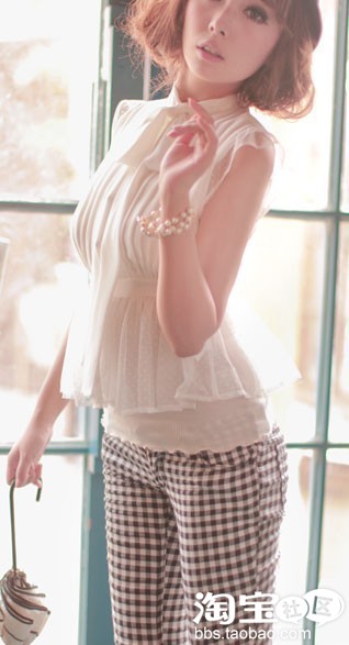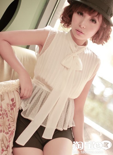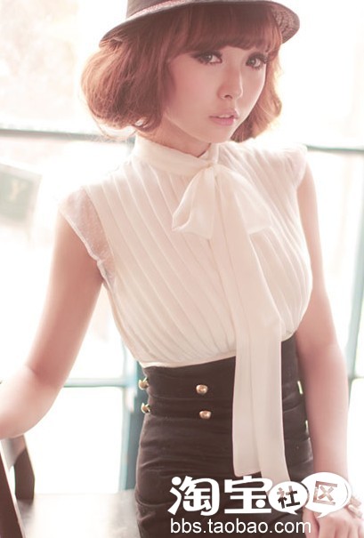 无袖式的设计很多时候女生会考虑到是否容易显得手臂粗,于是放弃购买。所以别小看了轻柔的薄纱飞边,其实是让手臂显瘦的妙处所在,一点点,正好能遮住手臂的上围,又能将无袖的清爽精神感觉hold住。小立领处可以巧妙利用蝴蝶结绳增加精致度,正式感增加。或是将绸带取下,直接清爽的穿也是不错的选择,那么推荐可以将最上面你的两颗纽扣解开,适当加入精致的项链很不错哦~~~它绝对是非常衬托女神优雅气质的上装。