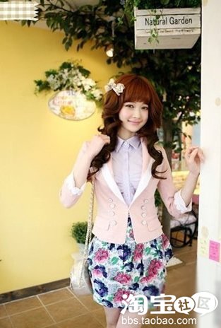 点评:搭配粉色小西装很显嫩,又很容易搭配衣服,搭配大印花半身裙并且用合身的衬衫作为内搭,显得活力十足又不失专属Office的谨慎态度。
