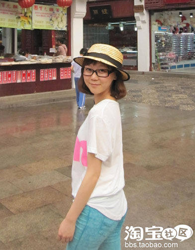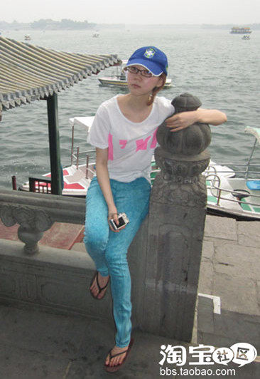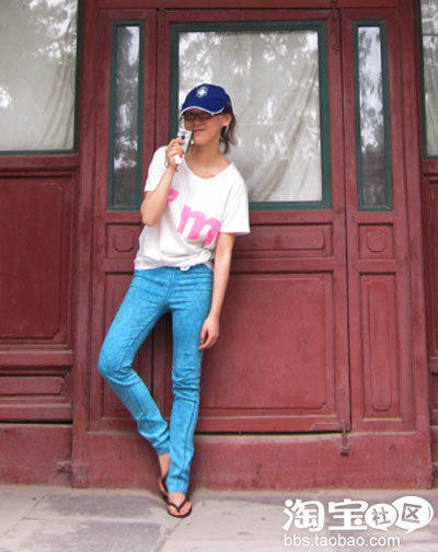 虽说是非常简单的T恤,但是宽松款式营造出的随意感很耐人寻味呢,醒目的枚红色字母和湖蓝色的铅笔裤上下呼应,有没有一点韩国妞儿的味道了?嘿嘿,我爱休闲的时尚。