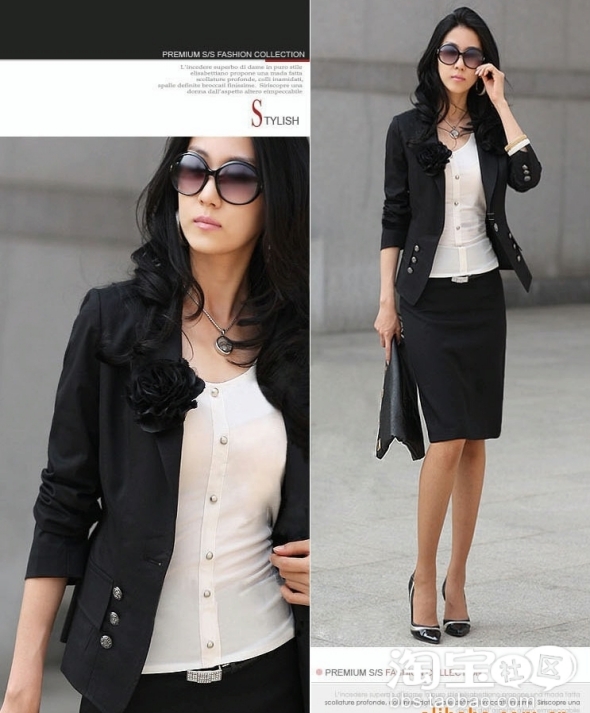 传统意义上的黑色西服套装给人一种严肃端庄的感觉。如果在黑色西服里面穿上一件白色或浅色的紧身圆领底胸开襟底衫,这样就与沉色的西服型成了强烈对比,使整体的色彩搭配上发生了跳跃性的变化,打破深色西服的单一的沉闷色彩,在整体穿着效果上大方得体,不失庄重气质,同时让又让时尚和性感得到升级,让你在同事及客户面前更为随和,更具有亲和力。