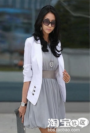 白色西服+浅灰色短裙是最简单和是最实用的搭配,没有过多的修饰和繁冗的层叠。浅灰色休闲半身裙也是今年最流行的款式之一,配上白色的修身的双排扣装饰的西服,带来的是一种清新的休闲风格,它正规方便而且百搭。在下班回家的路上只要脱去束身的西装,即刻可以帮你解除一天的工作劳累和紧张,使你变身为一位一失时尚休闲的女孩,这种搭配具有一件抵多件的实搭优势。
