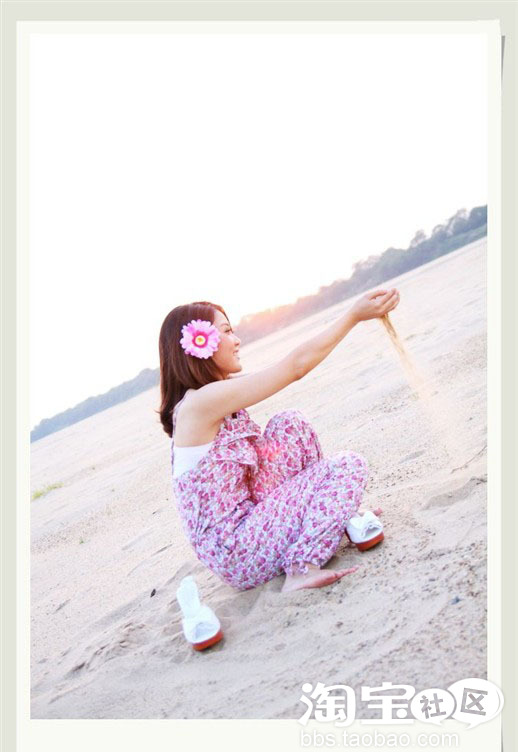 花布吊带裤+头上鲜花打造浪漫海边风情味