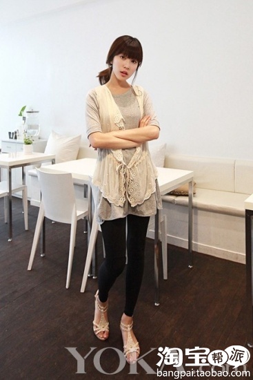 灰色五分袖TEE搭配一件甜美的花边小马甲,让单调的颜色立刻散发女人味。搭配一条简单的打底裤即可。
