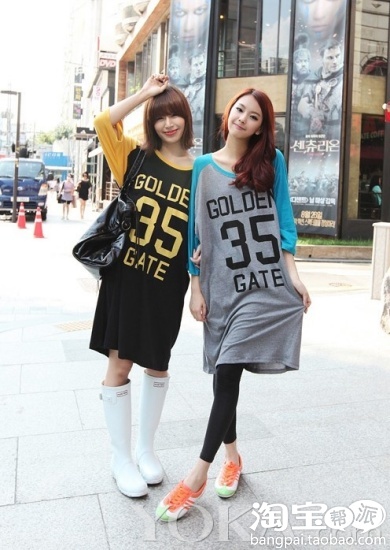 长款T恤可以搭配长靴OR雨靴穿着,也可以搭配黑色的打底裤,不用费脑搭配下装,一款亮色运动鞋让你更显活泼。