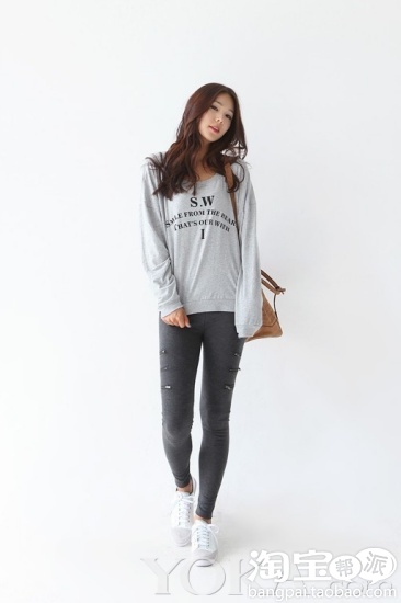 基本的纯棉款圆领套头衫,搭配一条同色系的灰色打底裤,破洞的设计相当街头范儿,让暗淡的颜色也不至于古板。