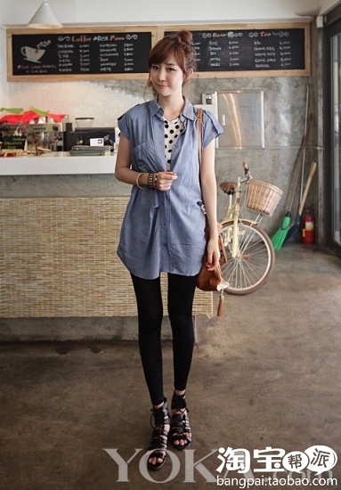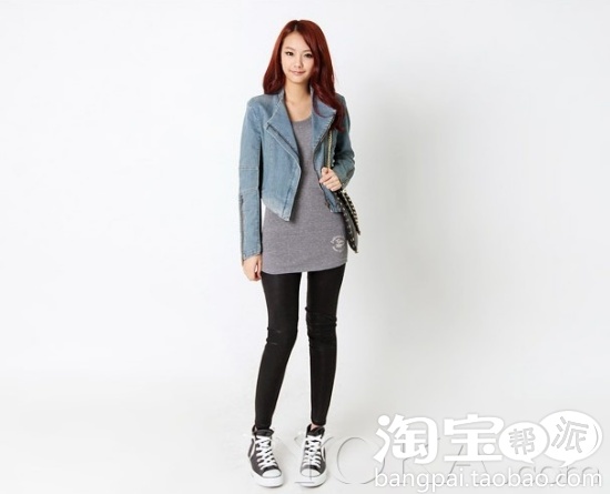 一件长款修身TEE搭配一件牛仔小外套,相当利落。搭配黑色的打底裤,让双腿显得更细。