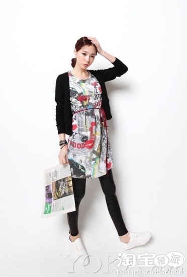 涂鸦般的服装搭配一件黑色针织衫,可以让连衣裙的缭乱感降低,搭配一双黑色打底裤,既呼应了上装,有突出了连衣裙。