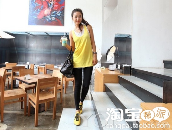 黄色与黑色的打底裤相组合,非常亮眼。层搭的TEE外面再配一件小西装,办公室这么穿也很合适。