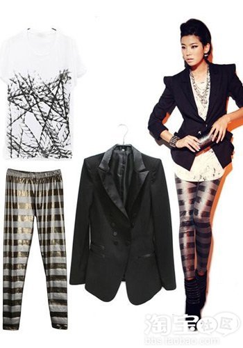 扩肩的设计十分精致,既达到了塑身造型的效果,亦能通过肩部的两只小角来突出高贵、冷傲的气质,很符合时尚摩登感。搭配势头强劲的银色斑马legging和独特的长版T恤,营造出收放结合的视觉节奏感,打造出极富个性的时尚风格,将帅气的中性风潮进行到底!