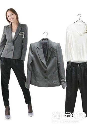 职场是严谨的、成熟的,职业女性追求时尚却又不宜过分矫情和张扬。西装的造型沿袭了男装的高垫肩风格,散发出浓厚的硬朗、帅气味道,充分地诠释和演绎了现代职业女性果敢的一面。搭配一条简洁的黑色九分哈伦西裤,既可将这种中性的美发挥到极致,又能拉长腿部线条。