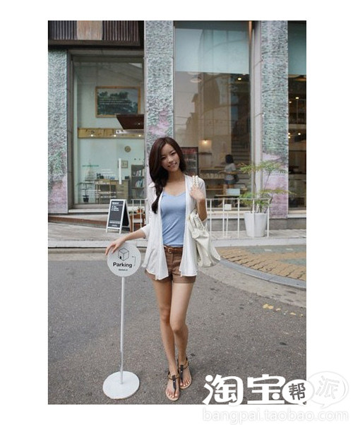 白搭丝光棉+浅蓝打底衫+棕色短裤