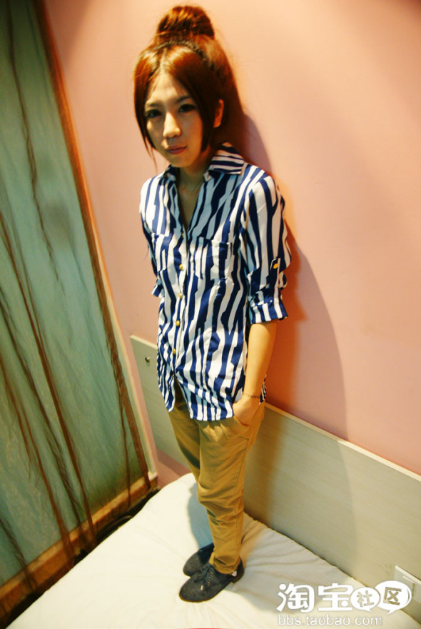 蓝条衬衫,搭配卡其裤。今年大热的穿法呢,哈哈