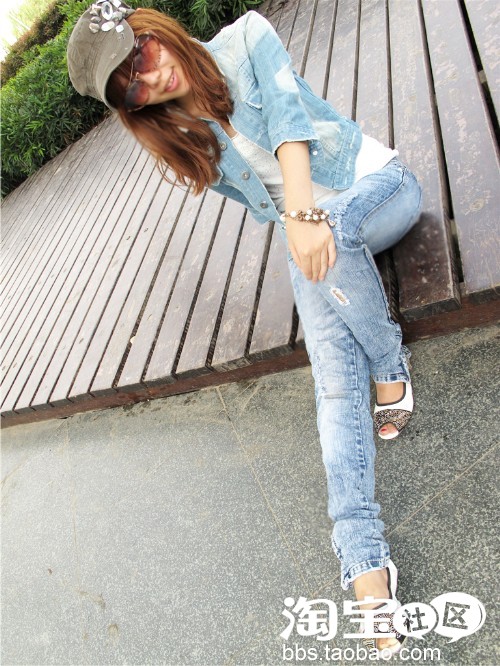 白色韩范衬衣+浅蓝铆钉破洞牛仔裤