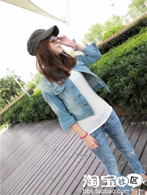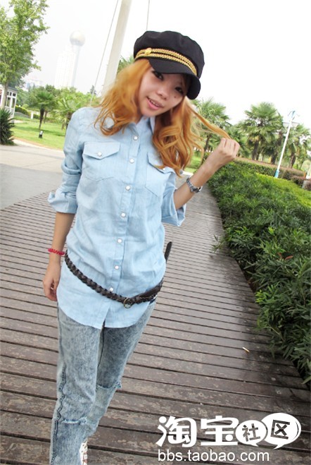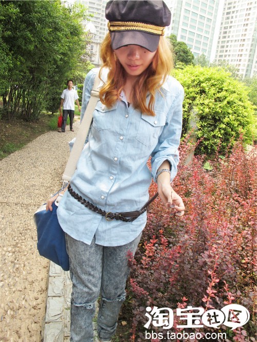 牛仔蓝修身衬衣+海军帽+破洞牛仔裤