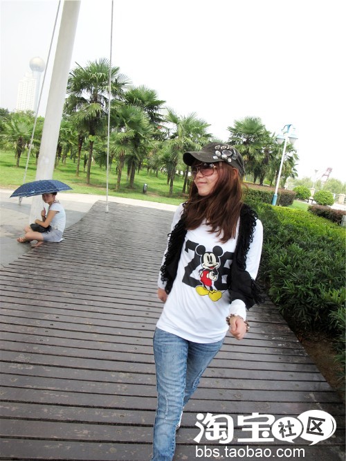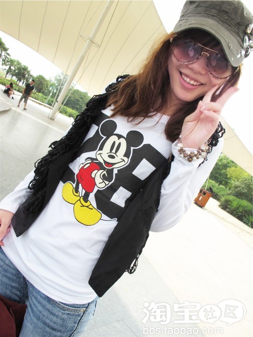 黑色显瘦羊滩马甲+可爱MICKEY长袖TEE+紧身牛仔裤