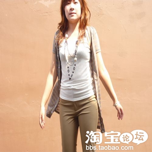2 素色吊带+条纹开衫+卡其裤子+毛衣链