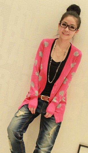 甜蜜感的三色针织衫,枚红色的大心心十分抢眼,粉嫩的颜色肯定会成为可爱女生的最爱,衣身上小小的爱心还十分的Q哦~~,到了秋天这样的针织衫真的非常实用
