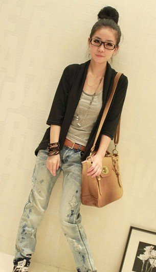 收腰新宠 前短后长黑色披肩针织衫+破洞磨白水洗浅色牛仔裤+复古渐变皮两用包。欧美中长袖白搭必备披肩衫,随性白搭款外贸日单全棉 软软的面料很舒适前短后长的设计看起来十分优雅腰部的收腰设计是较为突出的亮点针织开衫一直是很多MM心中的最爱。