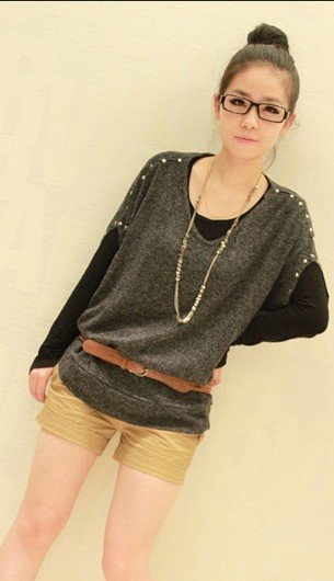 超显瘦的一款大蝙蝠袖针织衫,袖口的铆钉点缀朋克味十足,深灰色不像黑色会显得那么古板,无肩宽,适合各种身材的MM。里面还可以配个长袖条纹衫,下面配条深色打底裤,怎么穿都很美脚上再搭一双铆钉皮靴,超赞的^^