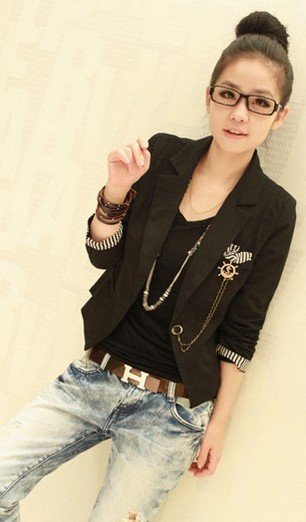 初秋必备的船锚装饰,外加流苏链的点缀,清新海军风的这款西装显得十分无敌,后背处开了五个省道哦,设计感很强