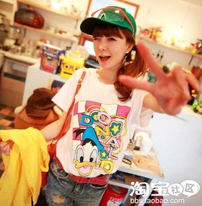 迪士尼卡通T恤搭配鸭舌帽、背带牛仔裤,让原本显得有些孩子气的T恤变得异常时尚。