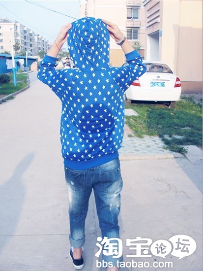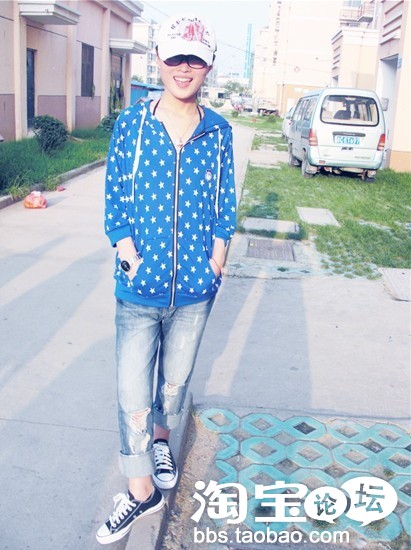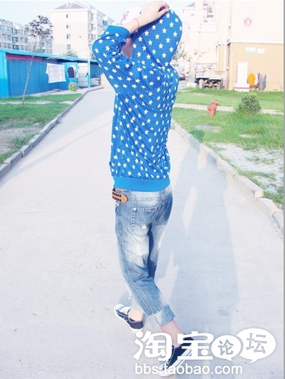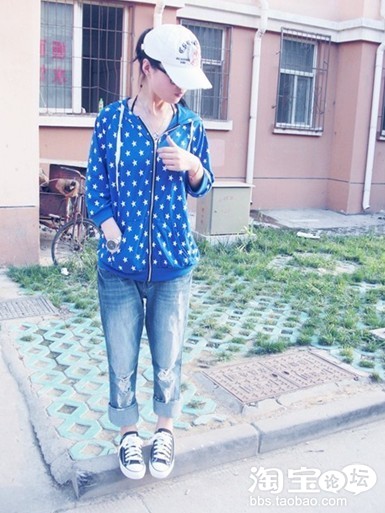 蓝色满星外套+ 宽松牛仔裤 +板鞋