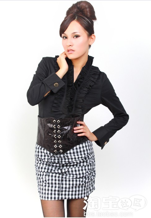 公主褶皱修身连体衬衣+黑色束腰带+黑白格子褶皱短裙