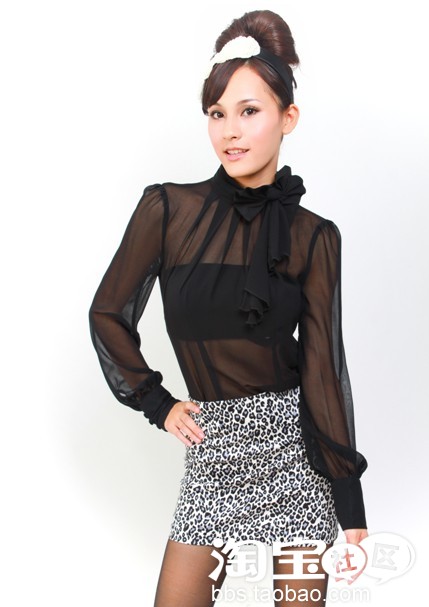 复古圆领蝴蝶结天丝连体罩衫+豹纹修身短裙
