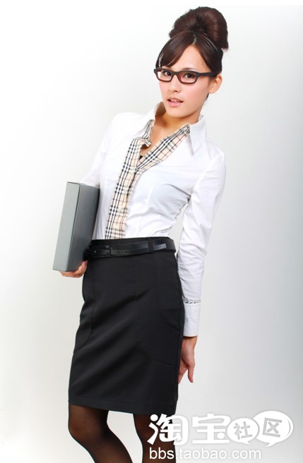 门襟经典格子白色连体衬衣+黑色修身工装半裙