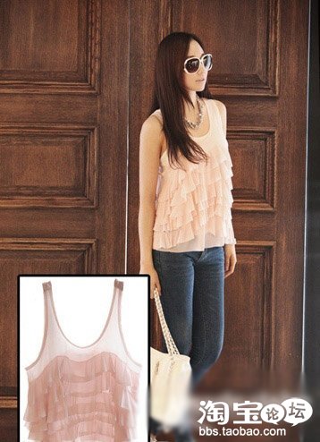 雪纺质地的层叠荷叶边不仅轻薄飘逸,而且可以起到视觉的加厚作用。胸小的MM,胳膊也偏细,穿件无袖小背心,遮住不足,露出细臂,刚刚好。