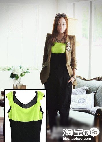 胸前那一条亮绿搭配下面全黑的着装,让局部视觉起到了膨胀与缩小的作用。不仅是亮绿,白色、黄色等浅色系都可以帮你达到这种效果,并且抓住深浅的结合更为明显。