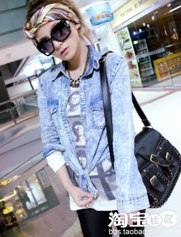 2:比较大胆的MM可以尝试整套牛仔的风格,下身可选择搭配比较深色系的牛仔裤+皮靴。打造60年代超复古风格。