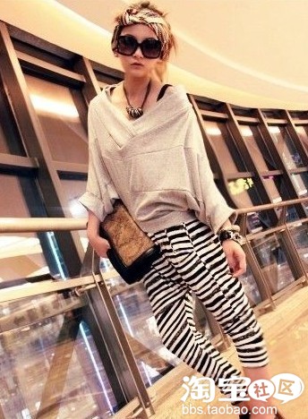 1:为了均衡我们肉肉女生的身材比例,搭配这种长宽宽松T,下身尽量配上比较修身的打底裤