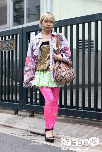金色亮片抹胸,果绿色短裙,荧光红破洞袜,迪斯科紫色外套,红绿灯在她面前都得甘拜下风。