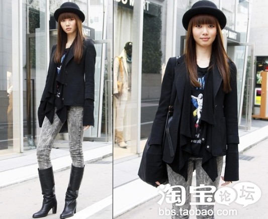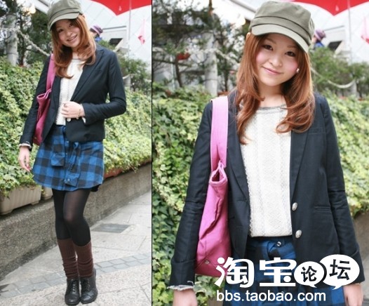 与短裙的搭配穿不好会让上身臃肿而下身单调,除了可以用对比色来分层次感外,还能在腿上和脚上下点功夫,可以尝试与大头靴和袜套搭配下。