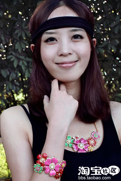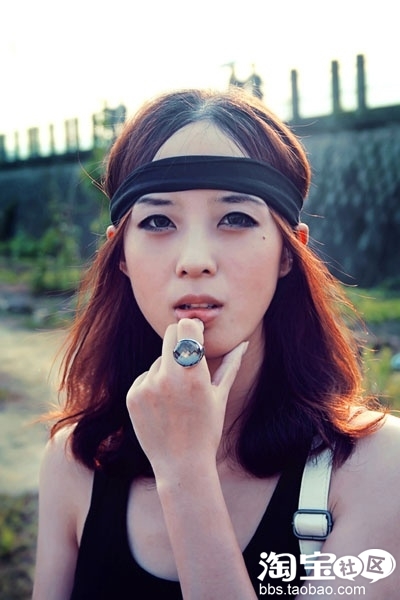 今年发带是要各种款式必备的噢,大花手镯和项链搭黑色背心真的恰到好处。