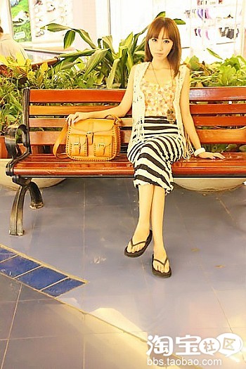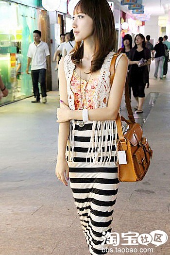 流苏针织背心+碎花吊带+黑白包裙+编织大包