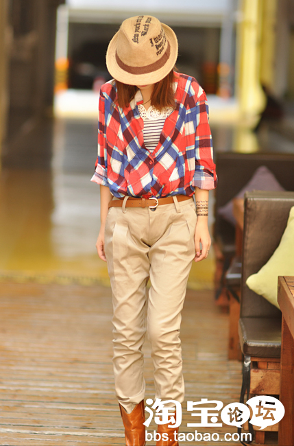 特别时尚一些的哦~~~~这款红蓝对比的条文,有点美国西部的感觉啦,搭上米色百搭裤和西部靴