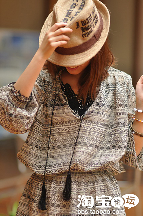 雪纺衫永远都流行~~但是偶觉得,在挑选雪纺衫的时候,要突出自己别具一格的话,,一定要挑选花纹特别的雪纺衫哦~~~很喜欢这款,平时雪纺都是很小女人的感觉,但这样的花纹再加上牛仔帽,就是另外一种感觉了,很酷很潮,欧美范