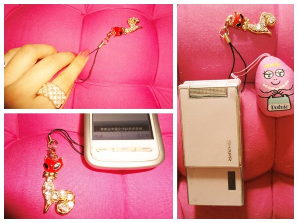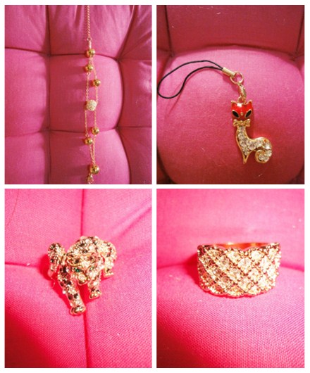 我购买的分别是两款水钻戒指、一款水钻手链、一款小狐狸手机链